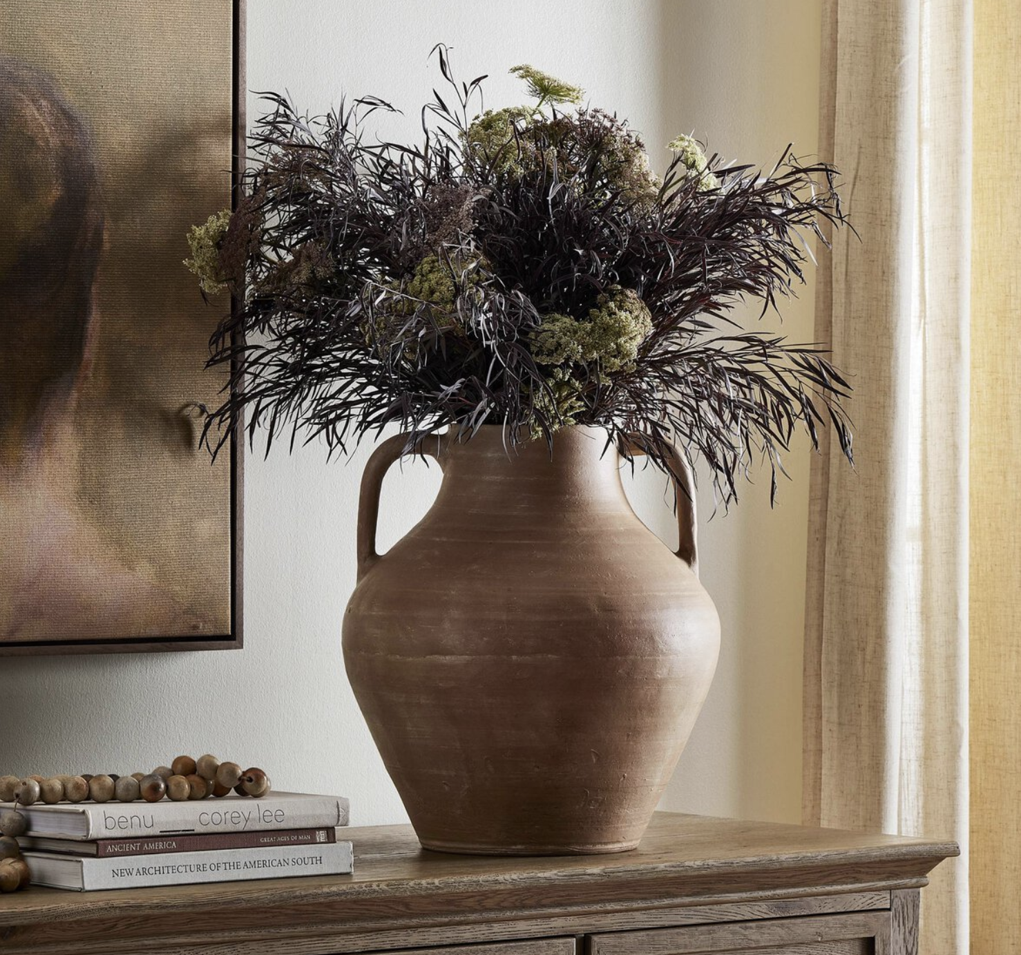 Aged terracotta is lightly antiqued, bringing a new, natural finish to this Grecian-style vase with slim arch handles. Hand-thrown clay ensures each piece has unique character. Not water-tight; for decorative use only.